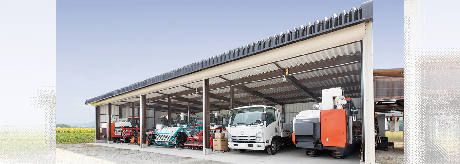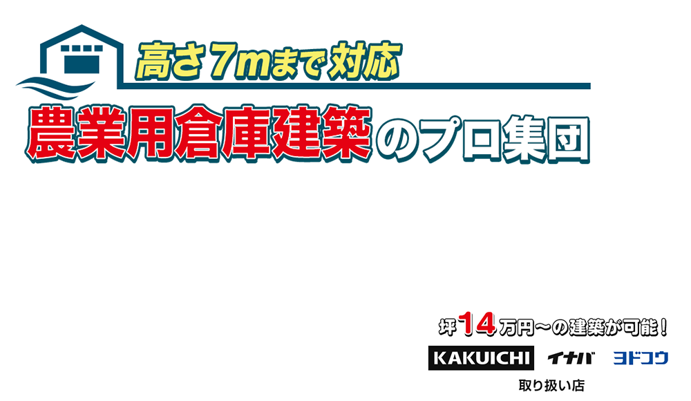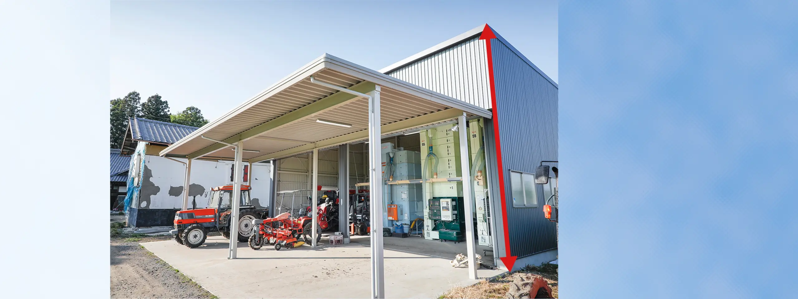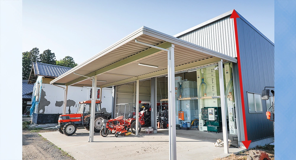 高さ6Mの大型倉庫、軒高50石の乾燥機や大型農工具もラクラク収納できます。